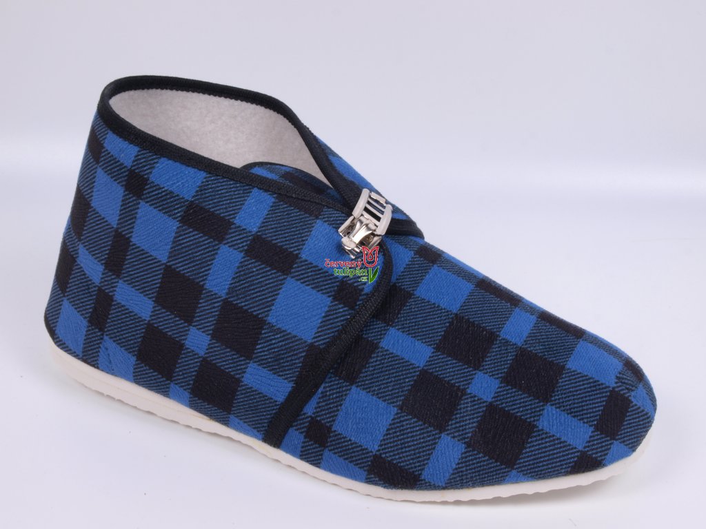 Hausschuhe BOKAP 073 Schuhe für Senioren mit Schnalle blau und schwarz kariert