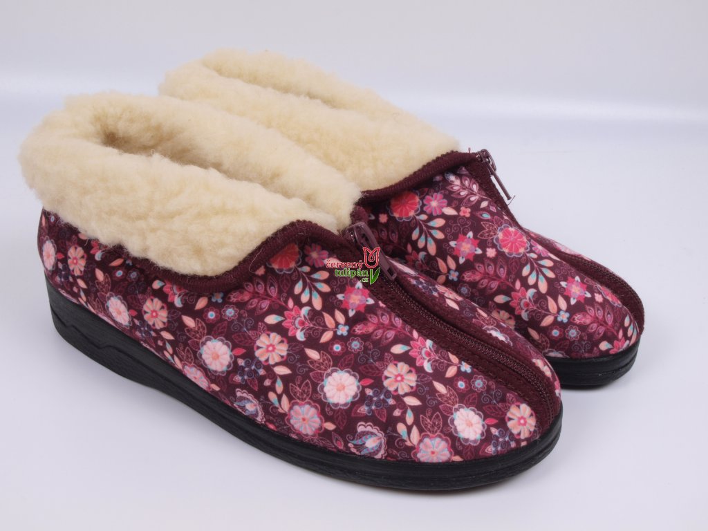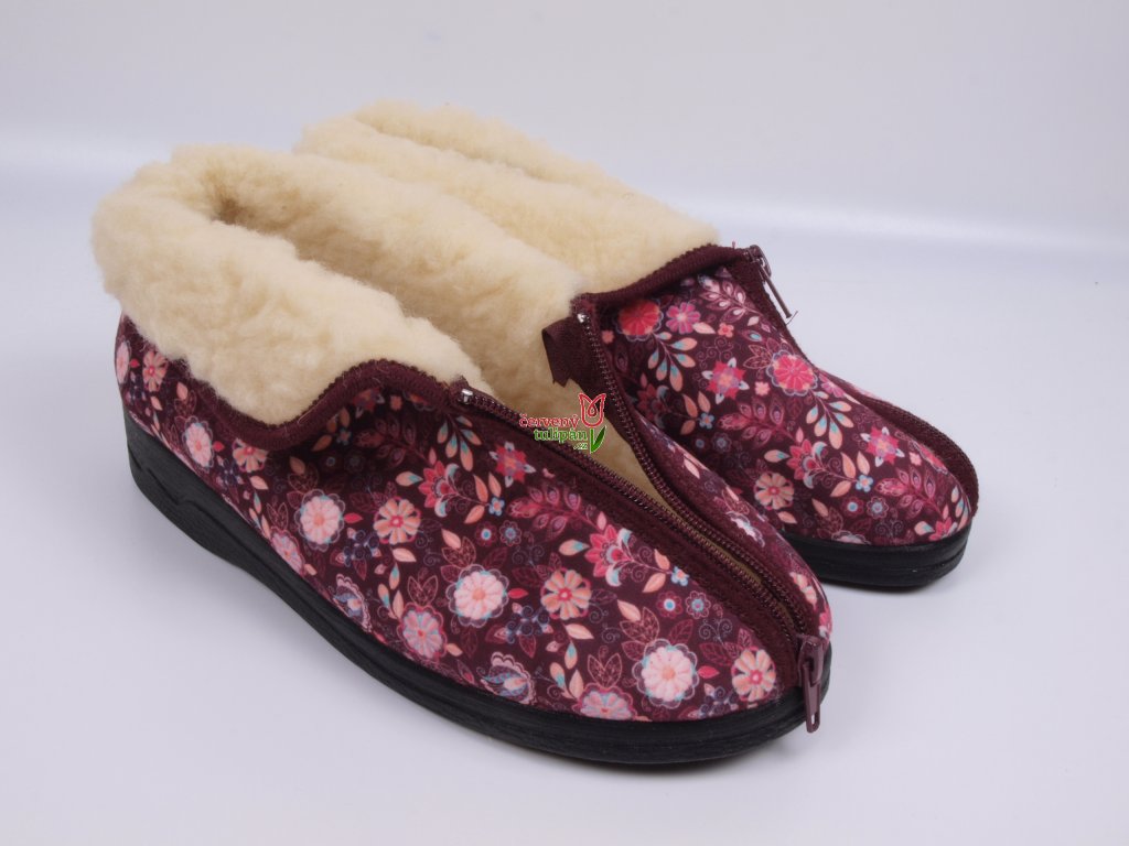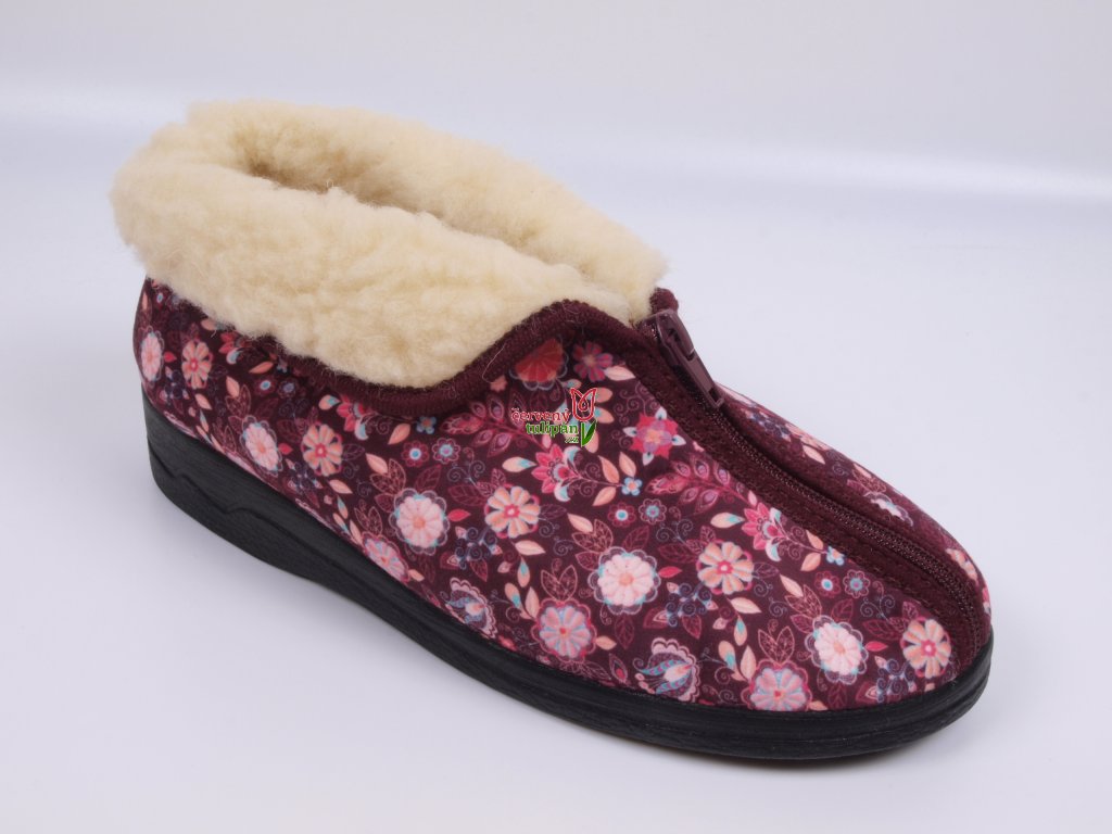 Teplé bačkory důchodky ADANEX 29841 vínové s kytičkami zateplené ovčí vlnou
