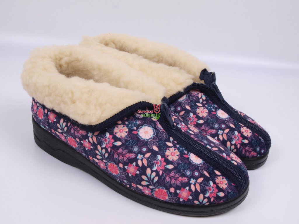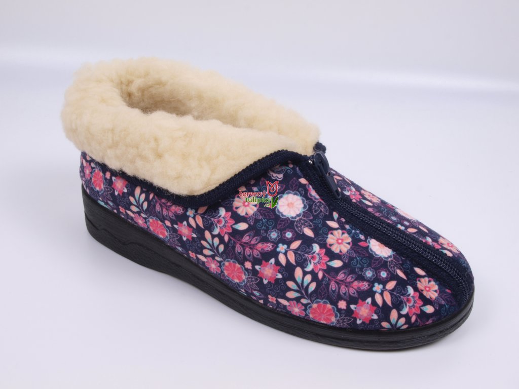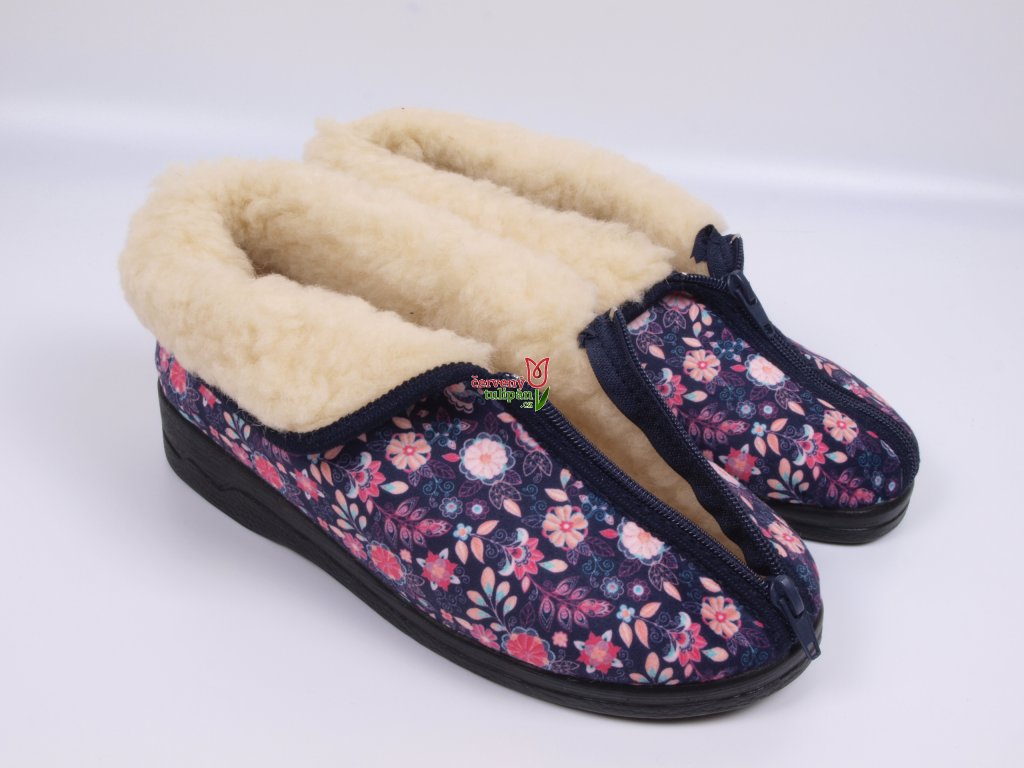 Teplé bačkory důchodky ADANEX 29847 tmavomodré s kytičkami zateplené ovčí vlnou