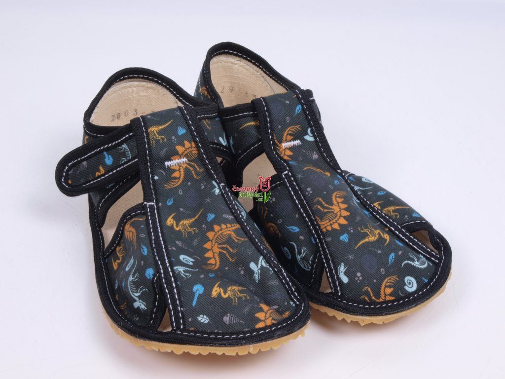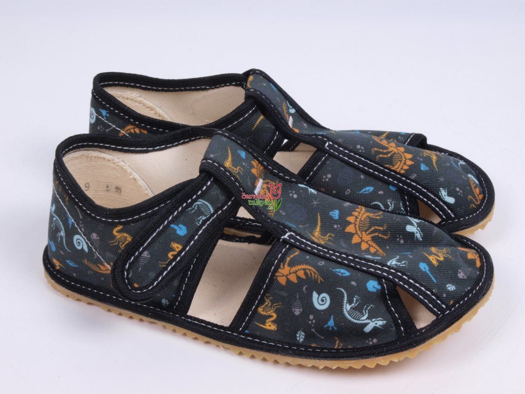 BareTulip dark grey slippers with dinosaurs, half-open BAREFOOT
