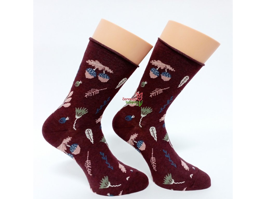 české ponožky TREPON EICHEL bordó s přírodním motivem s nesvírajícím ruličkovým lemem