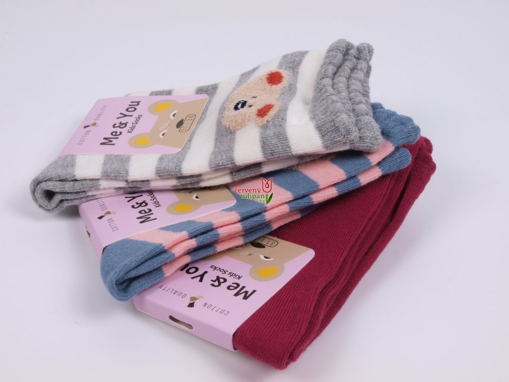 Ponožky DE 54260 SADA 3 PÁRŮ s medvídky - vínové, šedé pruhované, modrorůžové pruhované
