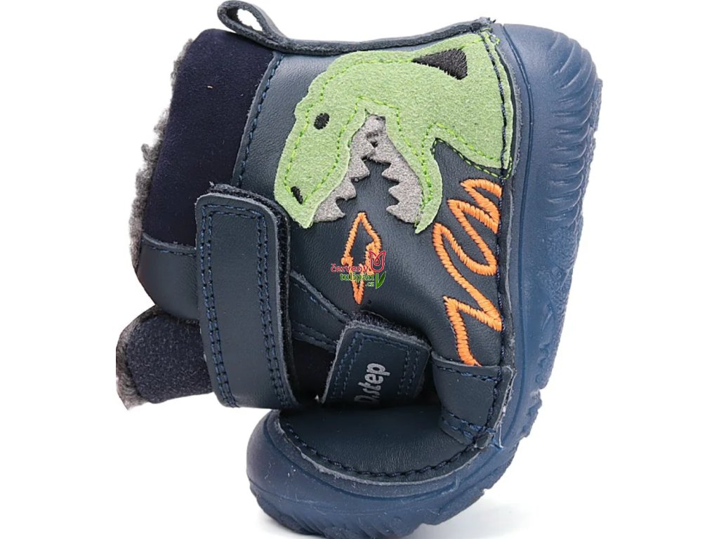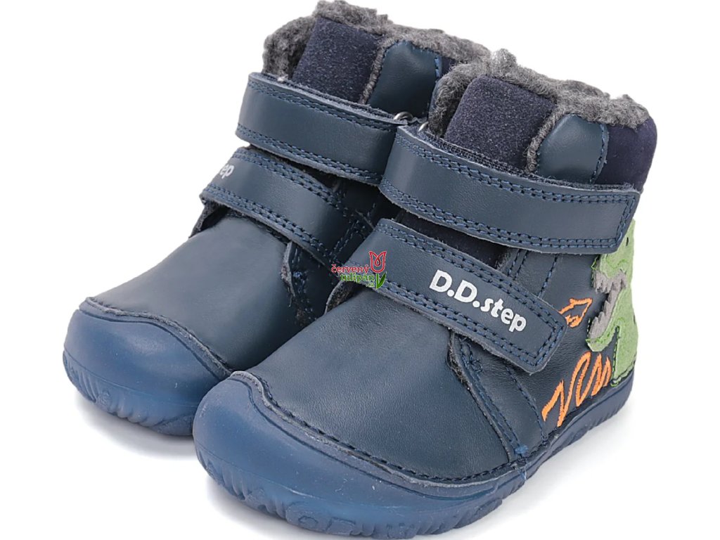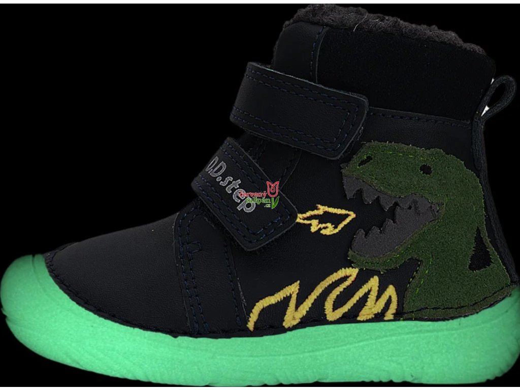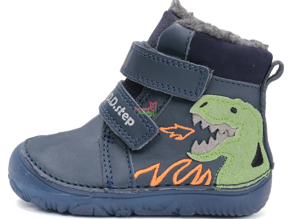 Zimní boty D.D. step kožené BAREFOOT W073-52943 modré s dinosaurem